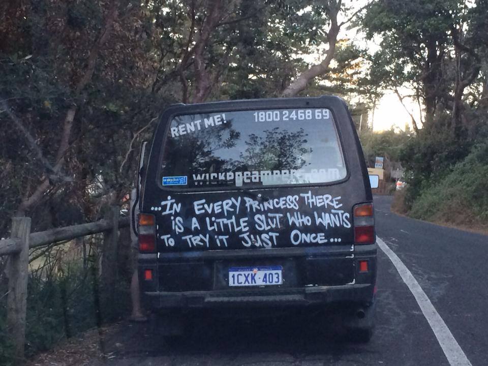 The Wicked people have capitalised on the old hippie van ideal and put fourth their own distasteful, twist with the slogans. I don’t care what they say is their market, the vast majority of young men today would not write these things themselves on their vans, but are maybe happy to drive around on a short holiday. I’m sure that its only because they can hide behind “It wasn’t me who wrote it, it came this way”.