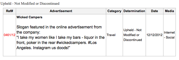 The first thing you have to do is check if there have already been complaints made and whether the Board has made any previous rulings. Unsurprisingly, the list of complaints is long for Wicked Campers with a variety of unsavoury slogans and advertisements, like the following: