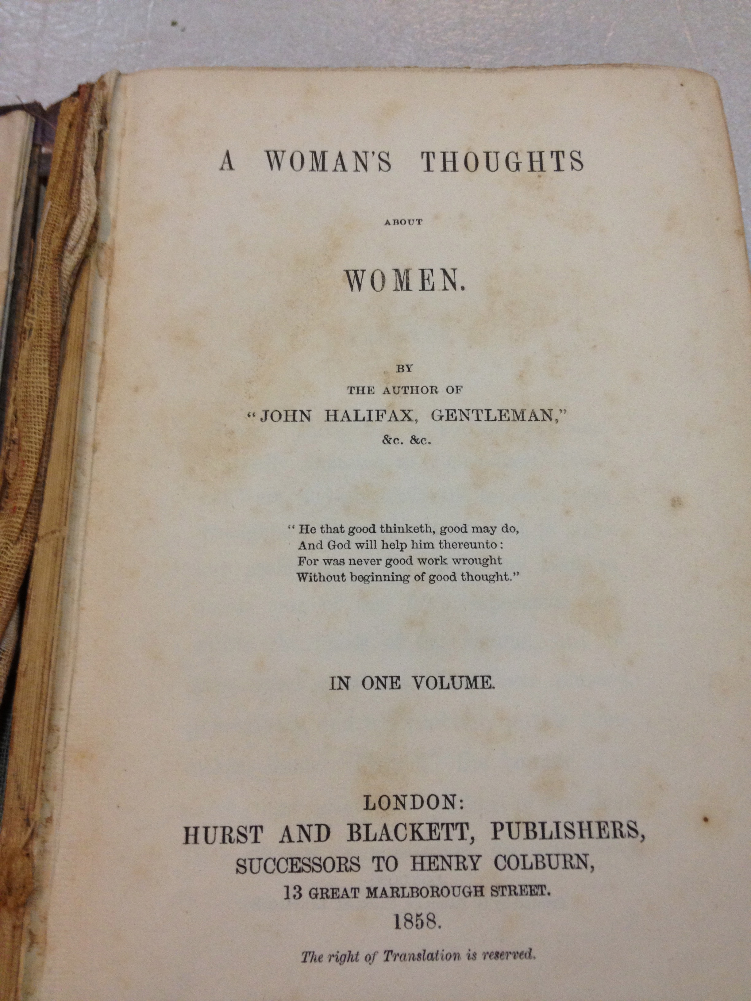 For Christmas, I received the truly magnificent, original book I called: A Woman’s Thoughts about Women by Dinah Craik – published in 1858.