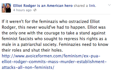 Last week I (along with so many others) continually sent complaints about the Elliot Rodger is an American hero page, petitioning it be taken down every time it popped up….over and over. Every single time I was told it was dandy for general viewing – as the screenshot below shows. Eventually, with so much pressure, Facebook took down all the pages glorifying Elliot Rodgers – and finally informed me that it was taken down.