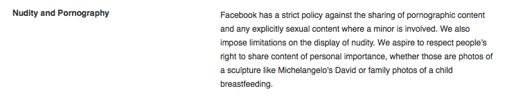 Facebook is dictating what pornography is and according to them, the above isn’t. I decided to look at the wording of their ‘standards’ and we’re ultimately screwed: