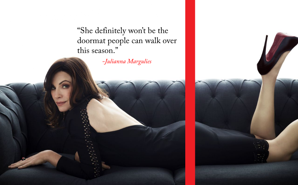 I don’t know if you watch regular TV, (I don’t have cable – just the free-to-air stuff), but The Good Wife ad has caught my attention. It saddens me that – beside the fact that some of the main female stars look like they’ve gone under the knife a few times – it seems nearly irrelevant that the ‘good’ wife is a lawyer. The WHOLE ad campaign leading up to the new season has her main photo in lingerie, there’s a sexy shot of her on a bed, with raunchy music playing throughout, and the slogan, “Don’t let the name fool you” – obviously…because she’s a naughty, naughty girl.