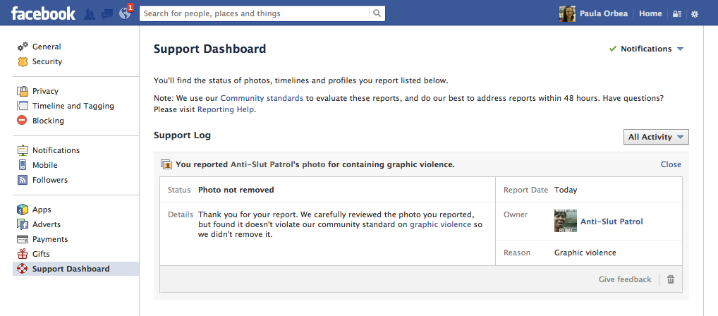 What I just noticed, however, is that they have – since last night – changed their Standards. I reported this photo under Graphic Violence (as it says in the screen shot) and now it’s called Graphic Content. I wrote them a response to their ‘ruling’ asking them to explain how the image is not graphic violence and what, to their standards, is.