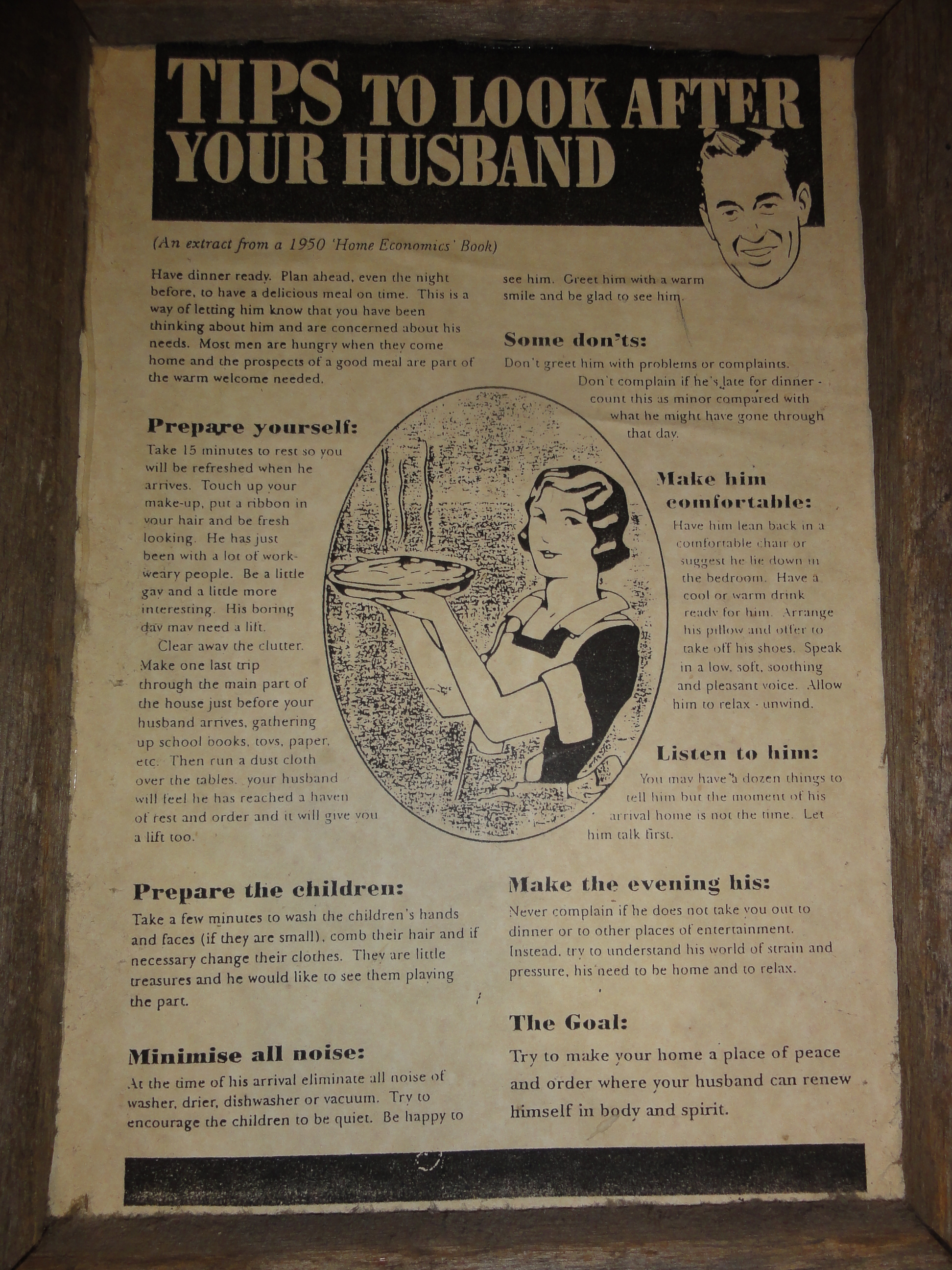 BUT at the same time, it got me thinking about how women seem to have always been instructed on how to behave towards men – 1950s: “The way to a man’s heart is through his stomach.” 2012: …I wouldn’t even know what to write here – I imagine it would be very sexual.